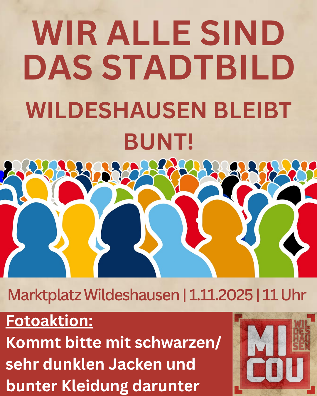 Mit COURAGE gegen Rechts – Wildeshausen schreibt: „Am Samstag, den 01. November 2025 um 11.00 Uhr wird auf dem Wildeshauser Marktplatz eine Kundgebung für ein gemeinsames Bekenntnis zur demokratischen Vielfalt und bunten Stadtkultur stattfinden. Das Bündnis ‚Mit COURAGE gegen Rechts‘ (MiCOU) ruft unter dem Motto „Wir alle sind das Stadtbild – Wildeshausen bleibt bunt!“ dazu… Pressemitteilung: Kundgebung in Wildeshausen, Marktplatz, 11:00 Uhr weiterlesen