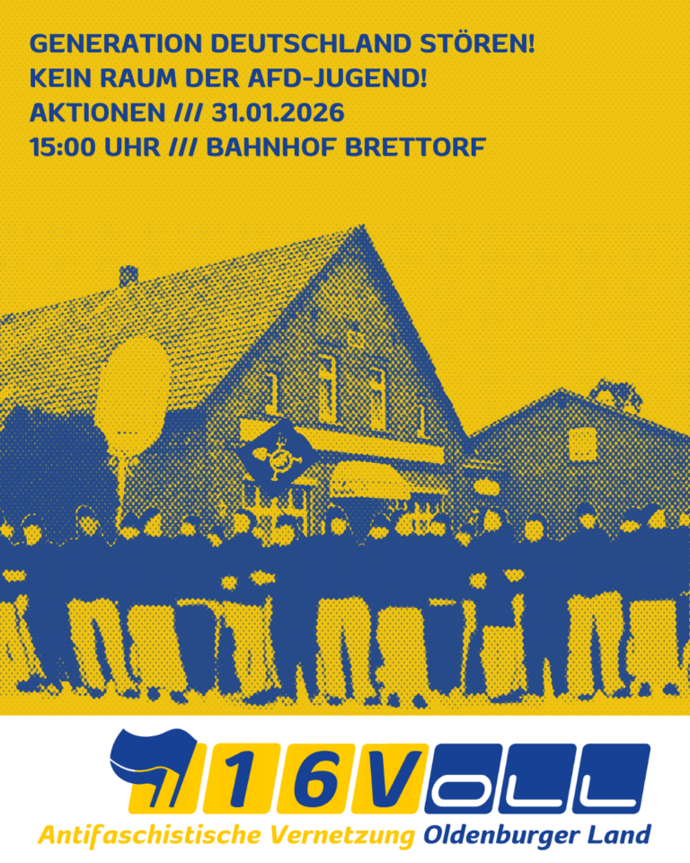 16voll schreibt: „Am Samstag, den 31.01.2026, soll ab 16:00 Uhr der „Neujahrsempfang“ der neuen AfD Jugendorganisation Generation Deutschland (GD) Niedersachsen starten. Ihr Veranstaltungsort ist der „Schützenhof Schürmann“ und neue Geschäftsstelle der AfD Niedersachsen in Brettorf (Gemeinde Dötlingen). Gemeinsam werden wir uns mit angereisten Antifaschist*innen beim Bahnhof treffen und uns anschließend von dort zum naheliegenden Veranstaltungsort… 31.01.2026: Aktionen in Brettorf (Dötlingen), 15:00 Uhr weiterlesen