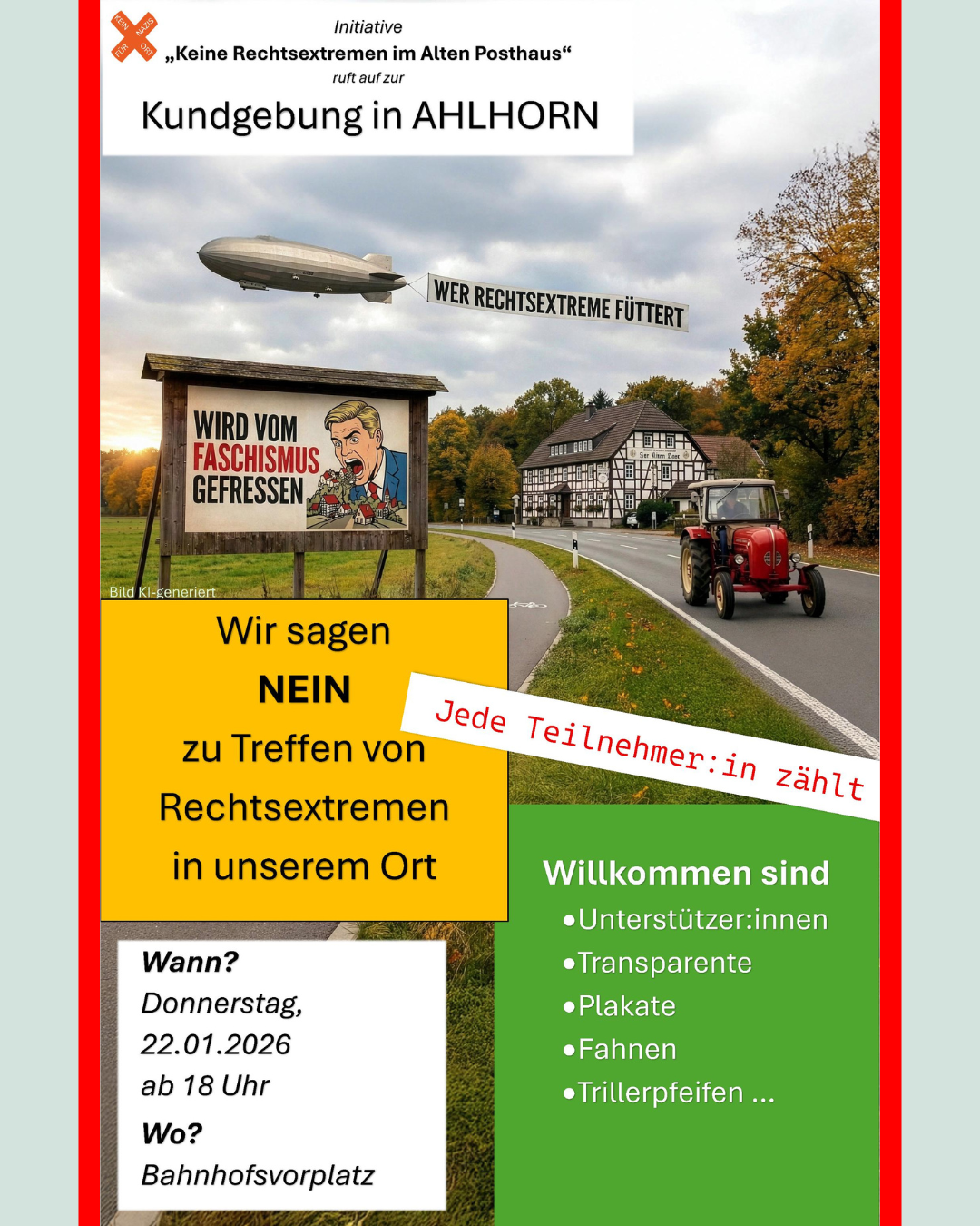 Darum: Unterstützt uns und kommt am 22. Januar 2026 um 18:00 Uhr zum Bahnhofsvorplatz in Ahlhorn!“